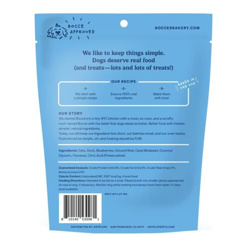 Oat Flour, Duck, Blueberries, Ground Rice, Ground Oats, Cane Molasses, Coconut Glycerin, Flaxseed, Citric Acid (Preservative).