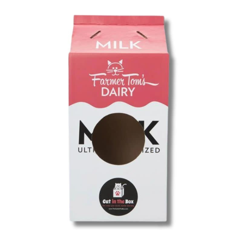 What feline doesn’t appreciate a nice saucer of milk? Perhaps he’d like to pour it himself. This oversized milk-container-shaped cardboard box toy for box-loving cats makes a great piece of cat furniture or cat cave for your cat to climb into. It is easily enjoyed on its side as well as in an upright position. And if your cat likes a good chuckle, perhaps he’ll enjoy the little bit of kitty humor on the carton, too.