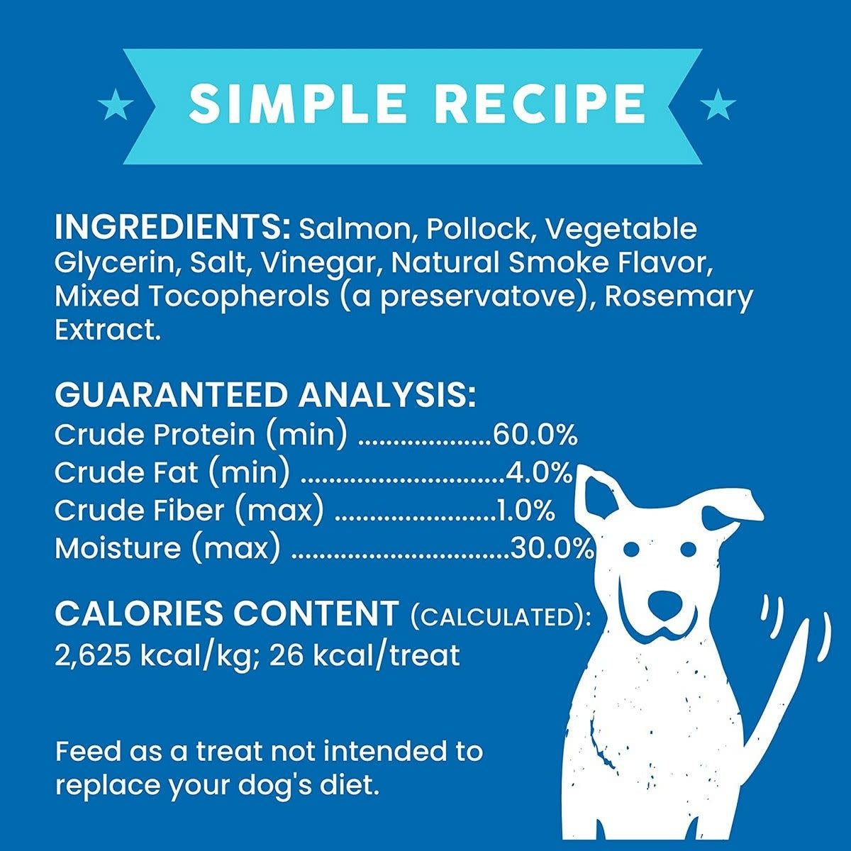 INGREDIENTS: Salmon, Pollock, Vegetable Glycerin, Salt, Vinegar, Natural Smoke Flavor, Mixed Tocopherols (a preservative), Rosemary Extract