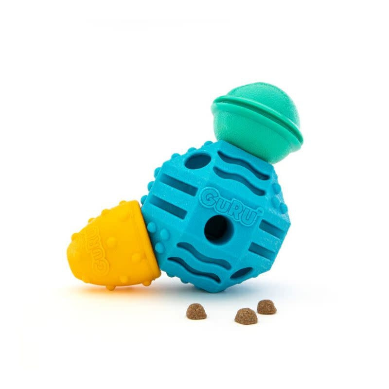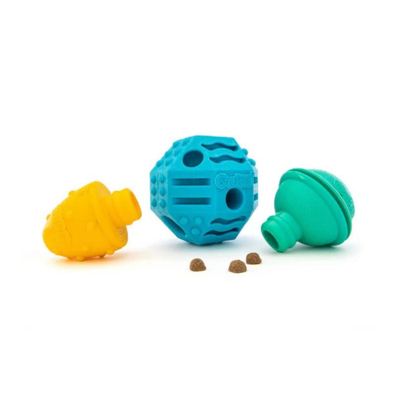 Erratic bouncing and tumbling engage dogs’ instincts to paw and work for food. Three uniquely textured components pop together, offering multiple pockets perfect for paste and treats. The Treat Station is made with Chew Pro™, GURU’s own ultra-durable, non-toxic thermoplastic rubber formulated specifically for safe, tough, and long-lasting play.