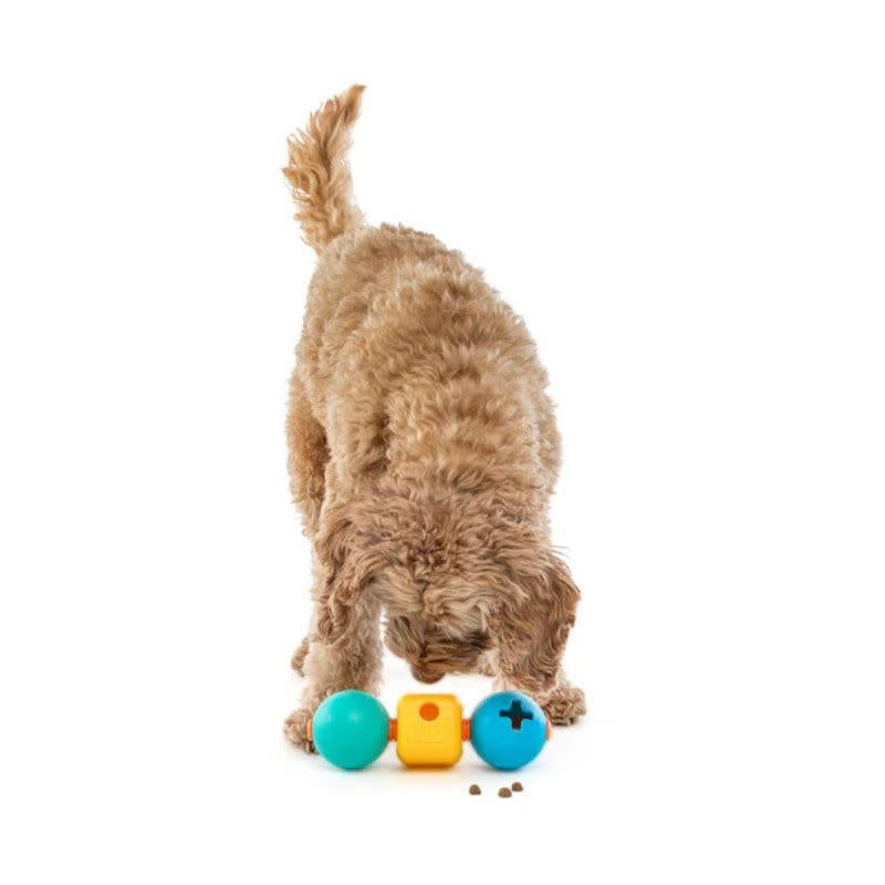 Engages dogs’ instincts to paw and work for food. Once loaded, the three differently shaped pieces spin independently while dispensing kibble as the dog plays. Each shape has varying levels of difficulty, challenging dogs to spin and roll the Treat Trio until the last piece of kibble is retrieved.