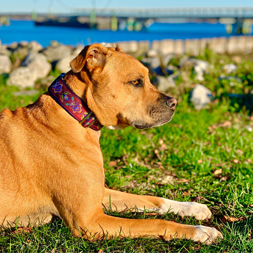 Mackenzie dog collars hand-stitched with one of a kind fabrics and the highest quality hardware available, right here in New England! Each collar is sewn with an inner satin lining for added comfort and luxury. This Europa collar in Burgundy has a cobalt satin lining that beautifully complements the intricate ribbon pattern on the front. Dedicated craftsmanship, the finest materials, and exquisite details make this collar uniquely beautiful and long-lasting!