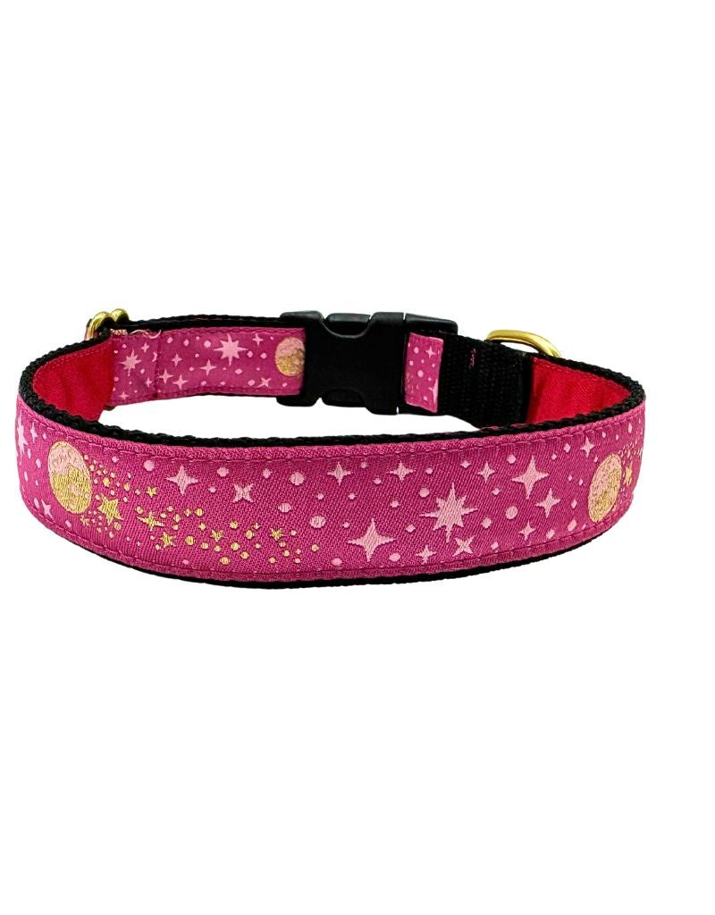 Mackenzie's dog collars and leashes are made of durable materials, hand-stitched for quality. Each collar also comes with a complementary inner satin lining. The MACKENZIE Star Gazer Clip Collar Pink is a stylish and functional accessory for your furry friend. With a width of 1 inch, it provides comfort and durability. Find out more about this chic collar.