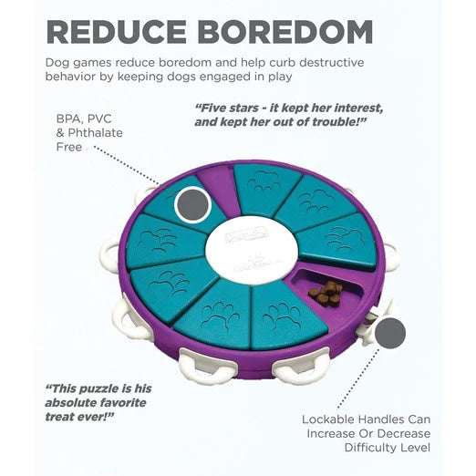 Nina Ottosson's Dog Twister Plastic Interactive Dog Toy stimulates and builds confidence for your dog over time, and makes training fun for you. Hide treats under the blocks, and let your dog hunt for treats by moving one block after another in different circles. Increase the degree of difficulty by locking the blocks with bone-shaped pegs, which are placed in the hollows all around the up-side of the game. Your pup has to learn to unplug the blocks by lifting the pegs one by one in order to be able to move the blocks and then find the treats. They'll love the reward of a job well done, and you'll love watching them put on their doggy thinking cap!