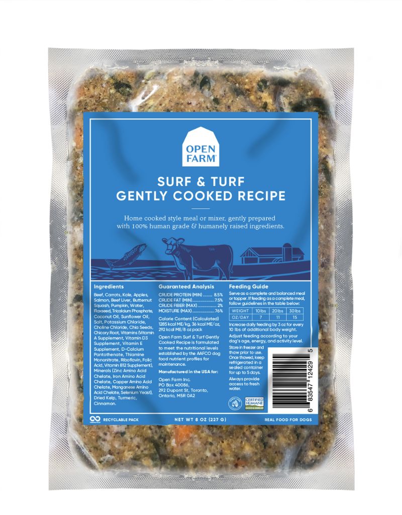 Open Farm Surf & Turf Gently Cooked Recipe is a delicious mix of humanely raised beef, sustainably sourced Wild Pacific salmon, and superfoods like non-GMO leafy greens, pumpkin, and coconut oil. Your furry friend only deserves the best and that means fresh food made from 100% human grade ingredients in a human grade facility. No matter how you serve it, it’s run-to-the-bowl delicious.