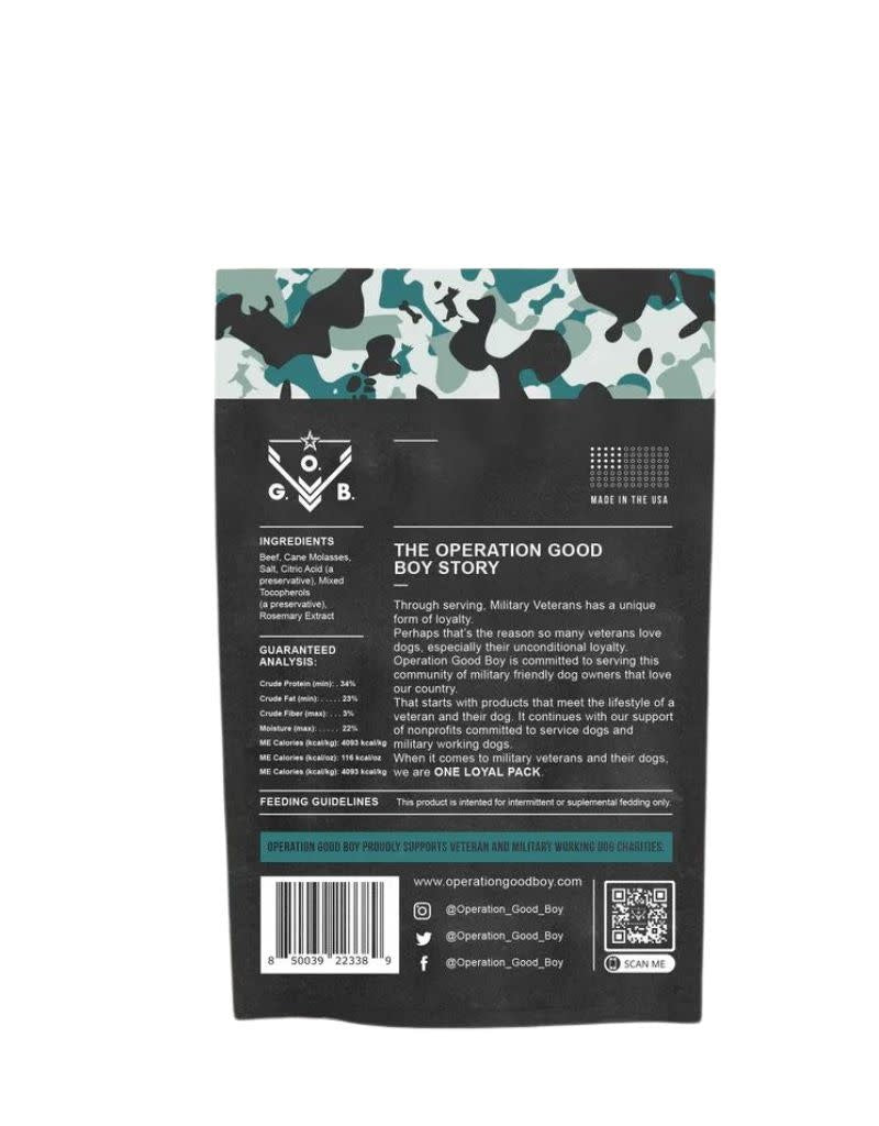 To veterans, the Stars and Stripes are more than just a pattern of red, white and blue cloth. It is an enduring symbol of the freedom and values we all cherish. Operation Good Boy’s “Stars & Strips” Jerky Strips give your dog meaty strips made with real meat and a chewy texture of genuine jerky. Stars & Strips Beef Jerky Strips. Made in the USA. Crafted to ensure your dog is getting a safe, quality jerky made from carefully selected ingredients. Convenient package to help preserve freshness. Veterinary-formulated. Makes training a breeze with easy, tasty positive reinforcement.