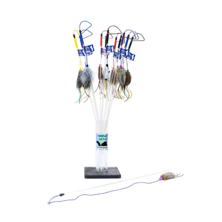 Only made from safe kitty-friendly materials that are gentle and non-toxic. Vee Enterprises' toys are gentle enough for your cat, yet durable enough to hold up against kitty's teeth and claws! This Purrfect Cat Toy features natural feathers and faux-fur with crunchy tear-resistant plastic for hours of durable play! Simulates natural prey to satisfy your cat's need to hunt! Also makes the perfect toy for spending some quality bonding time with your kitty! Made in USA.
