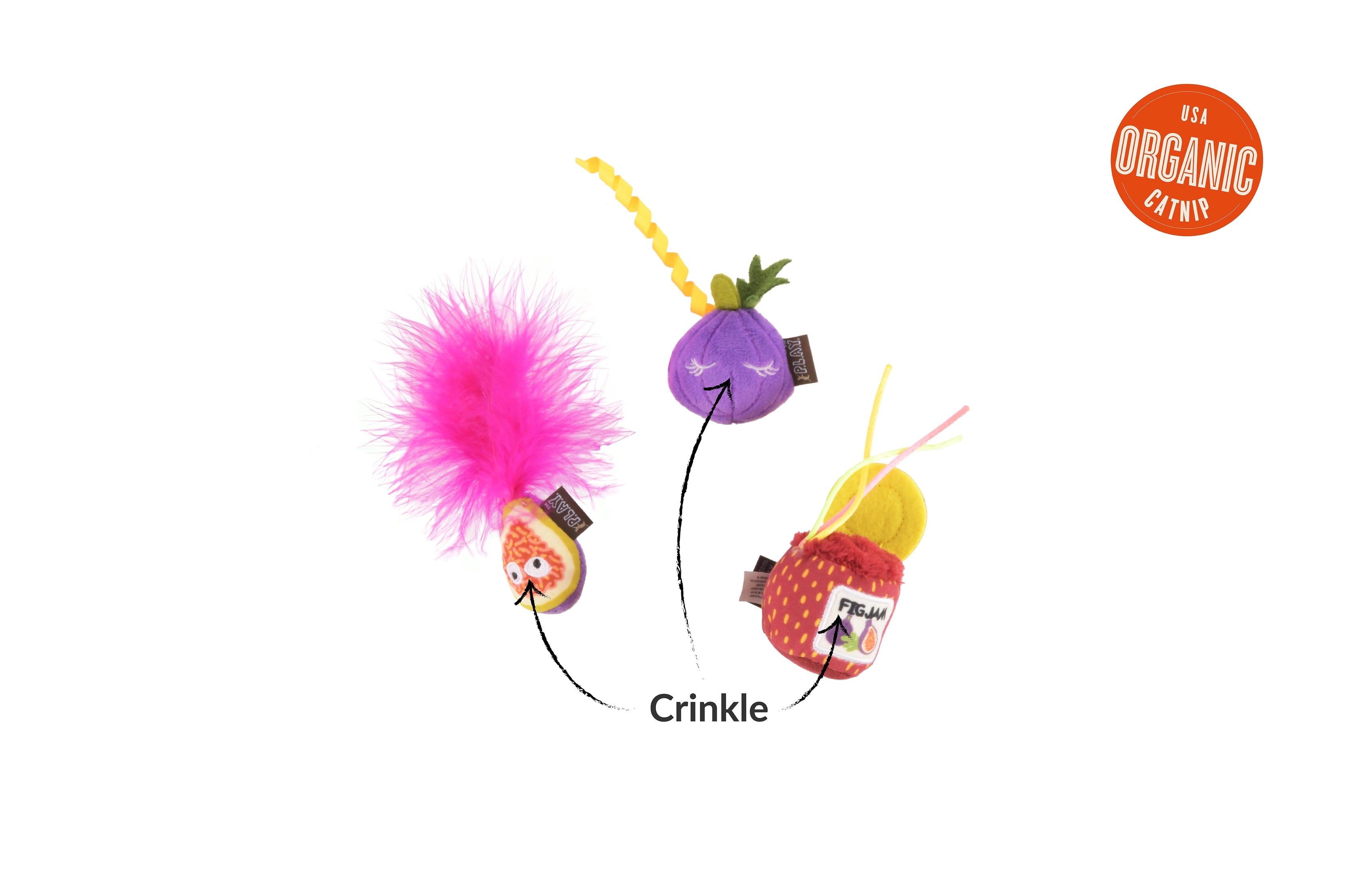 Sweeten up your cat’s toy collection with P.L.A.Y.’s Feline Frenzy Fig N' Whiskers, a plush catnip toy set featuring two fig-shaped and one jam-inspired designs that look as good as they feel! Stuffed with USDA-certified organic catnip in a refillable pocket and stitched with irresistible textures for hours of batting, wrestling, and nibbling, this trio is perfect for curious cats with a taste for the finer things.