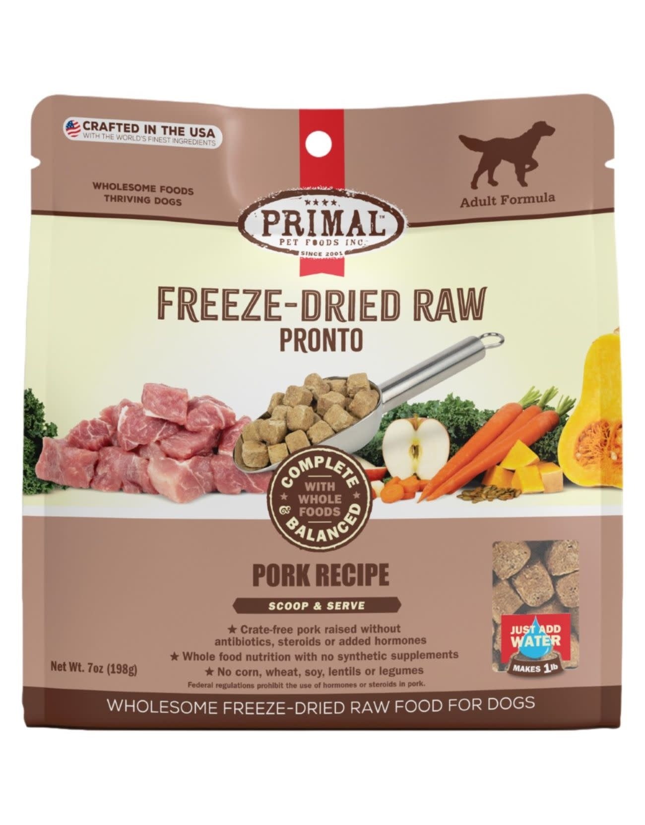 Pork (with ground bone), Pork Livers, Organic Kale, Organic Squash, Organic Carrot, Organic Apples, Organic Parsley, Organic Pumpkin Seeds, Organic Sunflower Seeds, Organic Broccoli, Organic Blueberries, Organic Cranberries, Organic Apple Cider Vinegar, Montmorillonite Clay, Dried Yeast, Fish Oil, Cod Liver Oil, Organic Coconut Oil, Organic Sunflower Oil, Organic Ground Alfalfa, Dried Organic Kelp, Liquid Lactobacillus acidophilus fermentation product, Liquid Lactobacillus casei fermentation product, Liquid Lactobacillus reuteri fermentation product, Liquid Bifidobacterium animalis fermentation product, Vitamin E Supplement, Organic Rosemary Extract, Taurine
