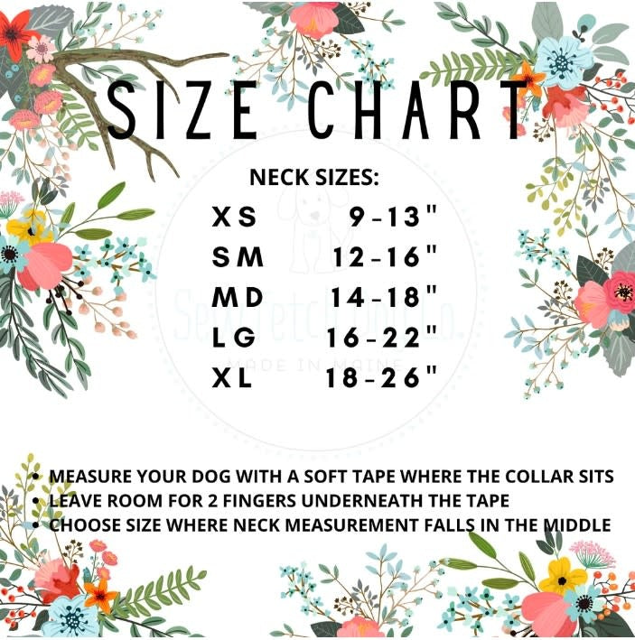 This beautiful collars are both functional and fashionable. Made with a heavy duty fabric sewn on top of nylon webbing that correlates perfectly, they finish the collars with a heavy duty metal slide D ring, and your choice of metal, plastic, or buckle-less with a martingale loop. They are strong, durable, and beautiful for your best friend.