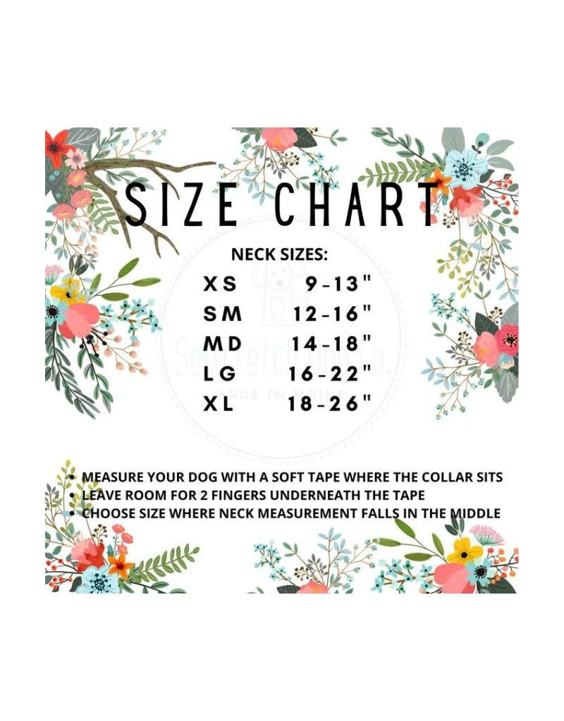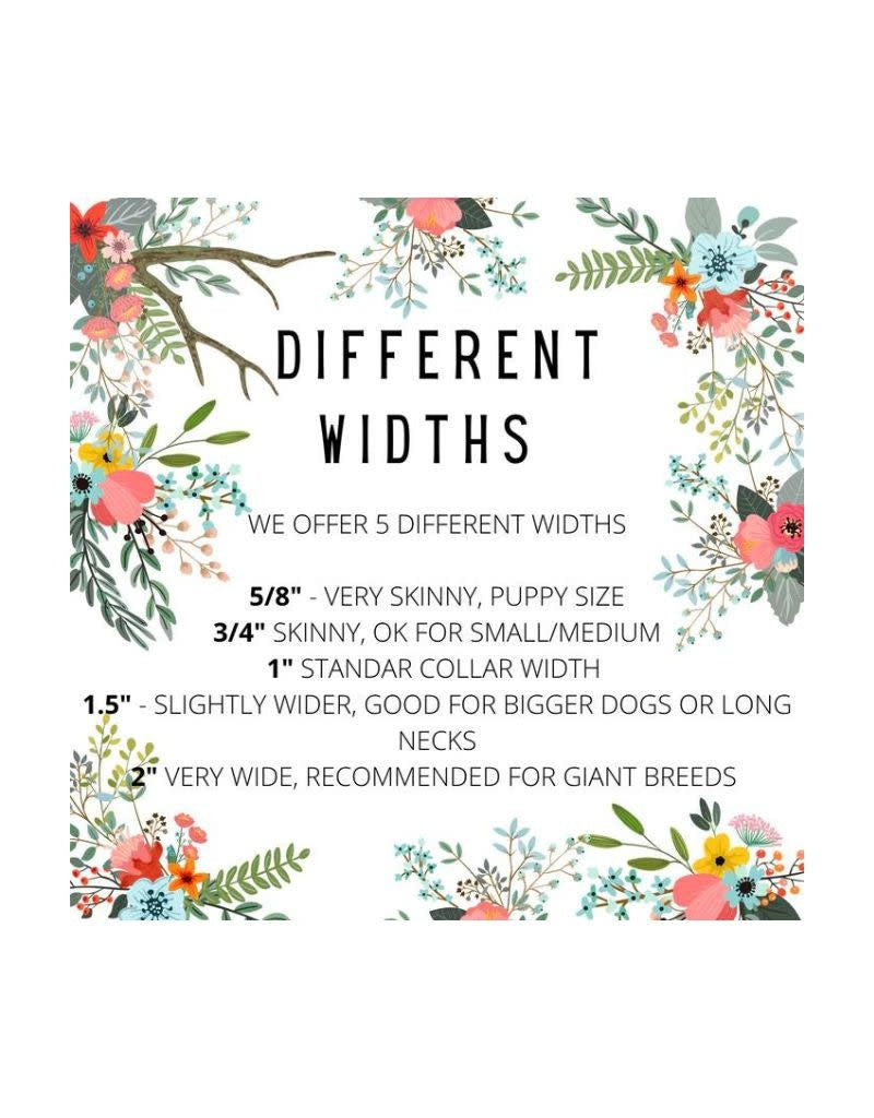 We strive for perfection in the production of our collars, please know they are handmade with love in our small shop. All pieces of fabric are cut, ironed, and sewn to be the right fit for your dog. Exact pattern placement will vary from collar to collar, though we aim to make sure the best pieces are visible. Different widths will show more or less of the pattern, the collar photographed in the listing is 1" wide.