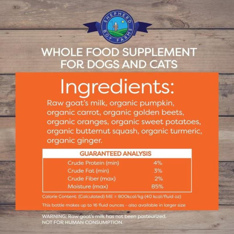 Raw Goat Milk, Organic Pumpkin, Organic Carrot, Organic Golden Beets, Organic Oranges, Organic Sweet Potato, Organic Butternut Squash, Organic Tumeric, Organic Ginger.