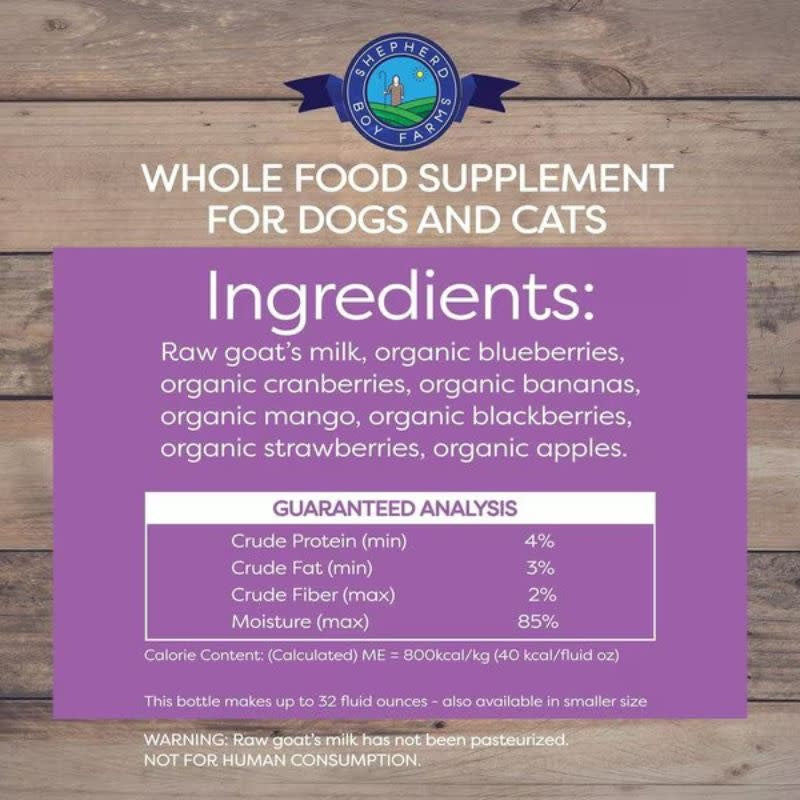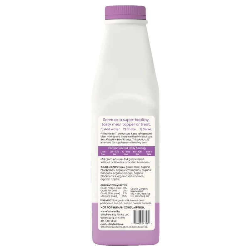 Raw Goat Milk, organic blueberries, organic cranberries, organic bananas, organic mango, organic blackberries, organic strawberries, organic apples.