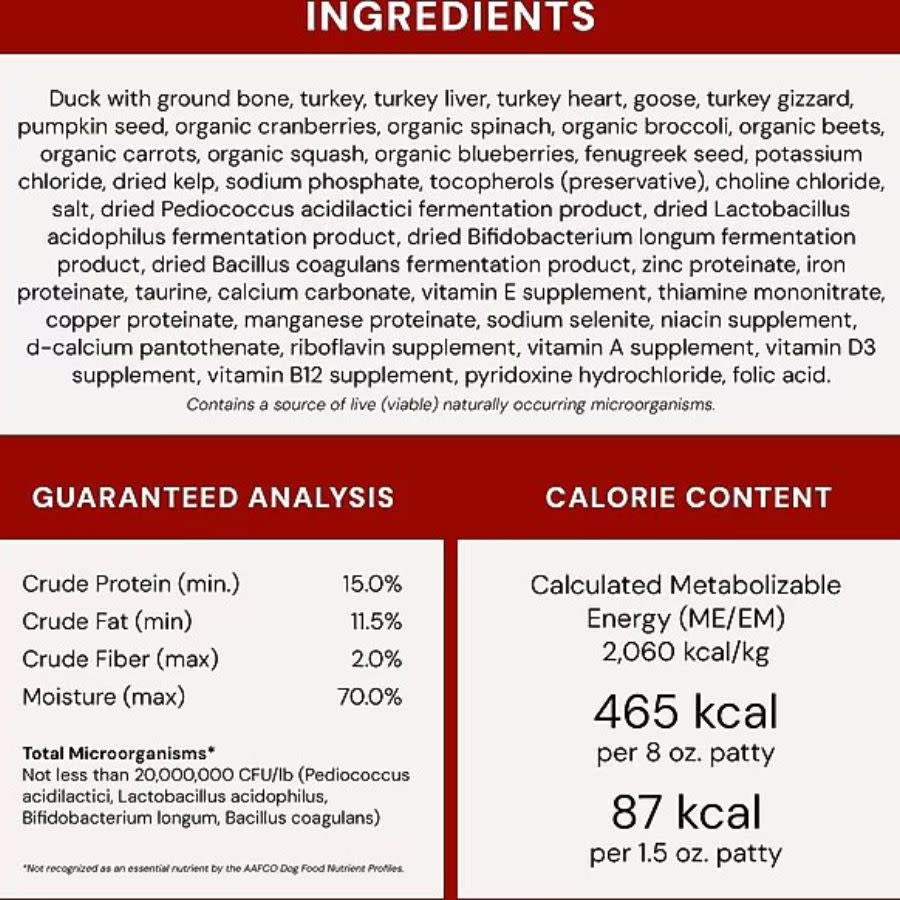 Made with 95% cage-free duck, turkey, and goose, along with nutrient-rich organs and bone, this raw blend provides a biologically appropriate, protein-packed diet for your pet. Plus, it's conveniently portioned and packaged in a resealable bag, making it easy to serve and store.