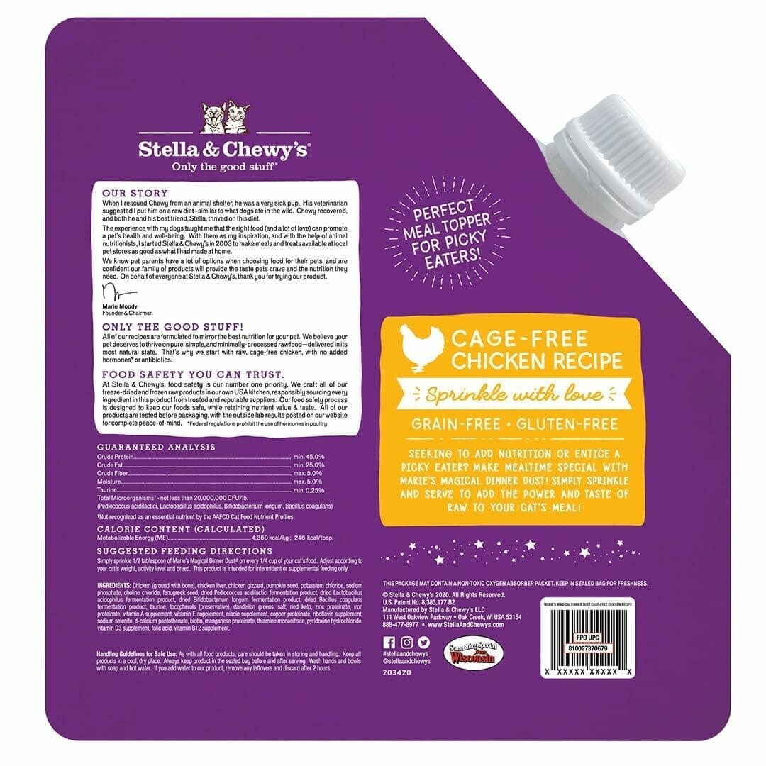 Chicken (ground with bone), chicken liver, chicken gizzard, pumpkin seed, potassium chloride, sodium phosphate, choline chloride, fenugreek seed, dried Pediococcus acidilactici fermentation product, dried Lactobacillus acidophilus fermentation product, dried Bifidobacterium longum fermentation product, dried Bacillus coagulans fermentation product, taurine, tocopherols (preservative), dandelion greens, salt, dried kelp, zinc proteinate, iron proteinate, vitamin A supplement, vitamin E supplement, niacin supplement, copper proteinate, riboflavin supplement, sodium selenite, d-calcium pantothenate, biotin, manganese proteinate, thiamine mononitrate, pyridoxine hydrochloride, vitamin D3 supplement, folic acid, vitamin B12 supplement.