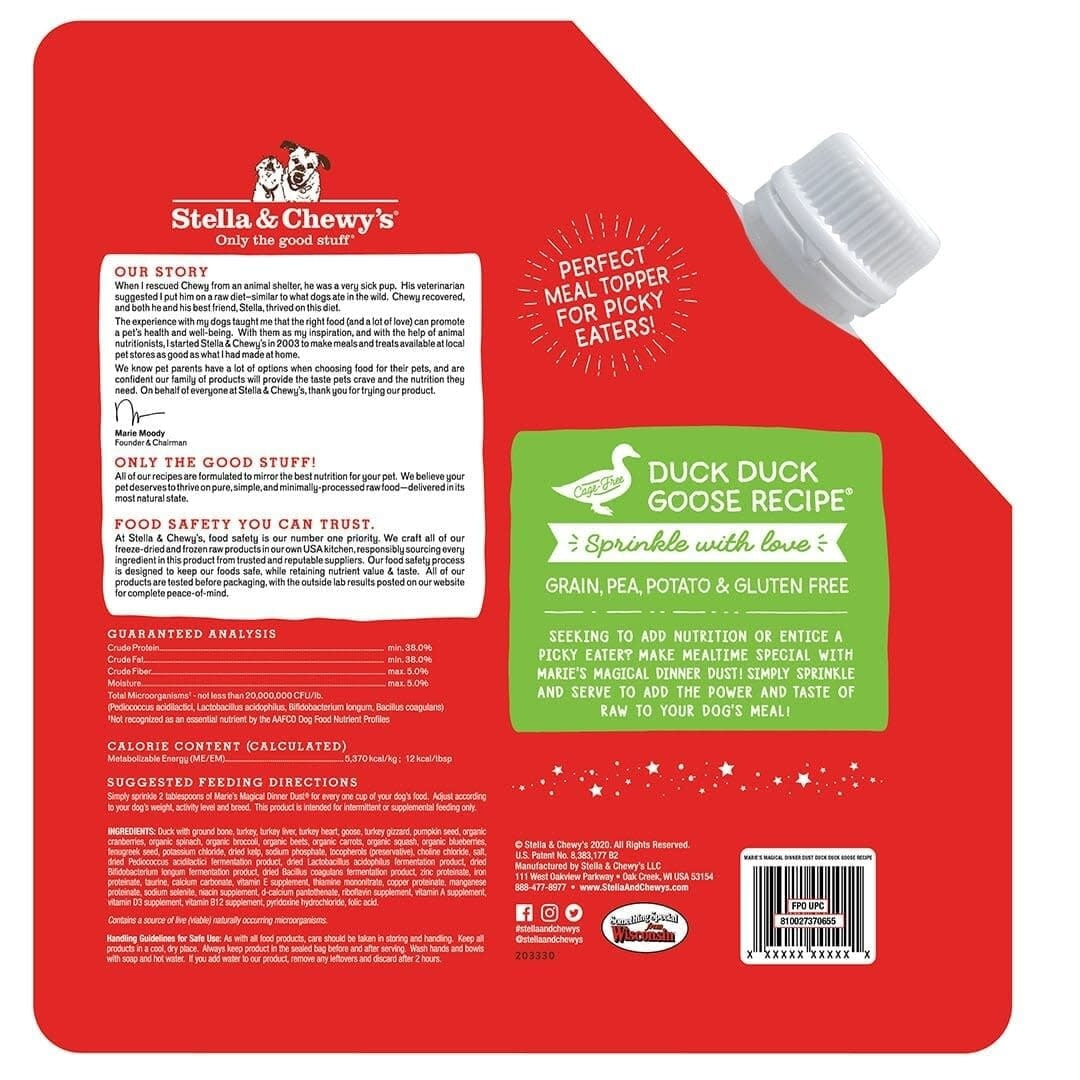 Duck with ground bone, turkey, turkey liver, turkey heart, goose, turkey gizzard, pumpkin seed, organic cranberries, organic spinach, organic broccoli, organic beets, organic carrots, organic squash, organic blueberries, fenugreek seed, potassium chloride, dried kelp, sodium phosphate, tocopherols (preservative), choline chloride, salt, dried pediococcus acidilactici fermentation product, dried lactobacillus acidophilus fermentation product, dried bifidobacterium longum fermentation product, dried bacillus coagulans fermentation product, zinc proteinate, iron proteinate, taurine, calcium carbonate, vitamin E supplement, thiamine mononitrate, copper proteinate, manganese proteinate, sodium selenite, niacin supplement, d-Calcium pantothenate, riboflavin supplement, vitamin A supplement, vitamin D3 supplement, vitamin B12 supplement, pyridoxine hydrochloride, folic acid.