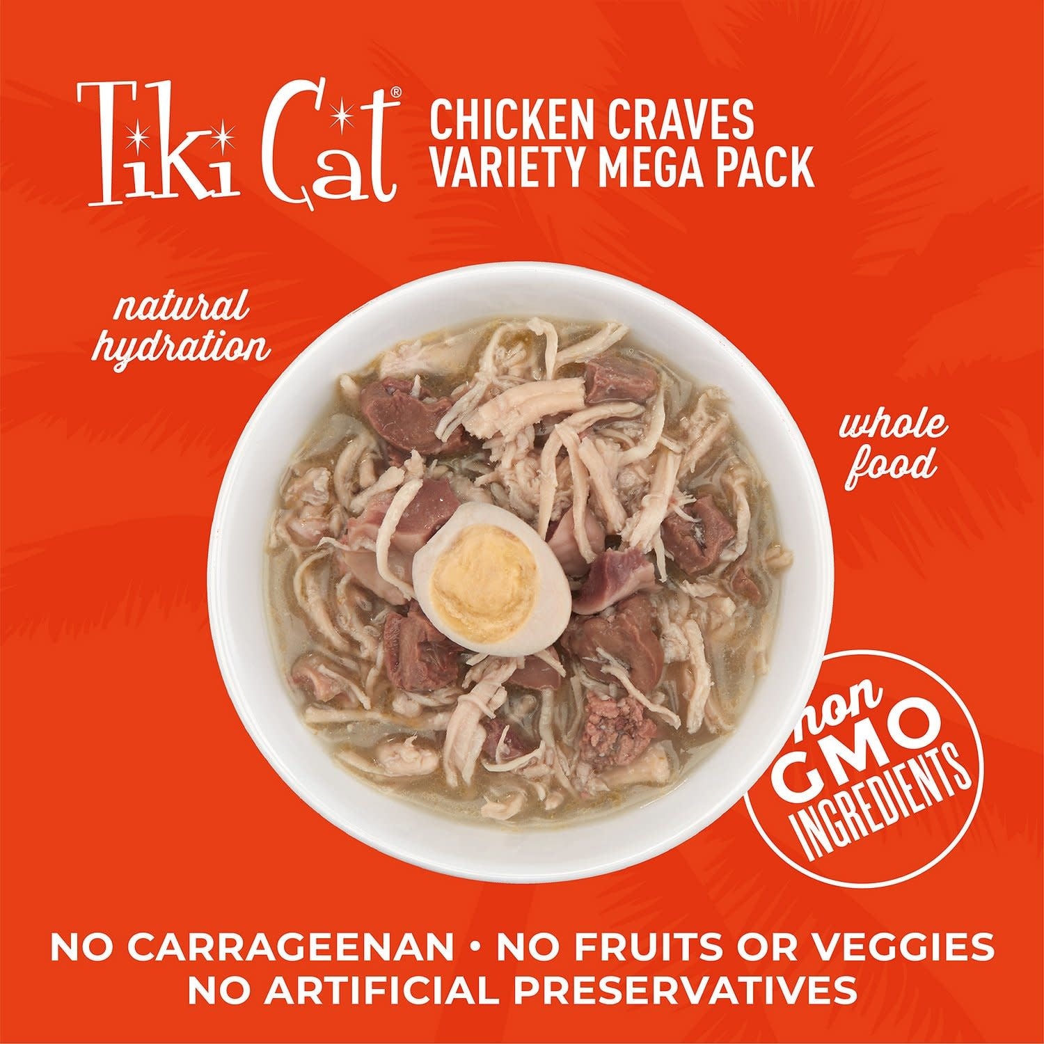The ultimate variety pack for chicken-loving cats! The Tiki Cat Chicken Craves Mega Pack is perfect for multi-cat households or those who simply prefer less shopping trips, with 36 servings of the high-protein, high-moisture nutrition cats need as carnivores. 20 servings are Tiki Cat After Dark recipes, which feature real chicken and flavorful, nutrient-dense organ meats, and 16 servings are Tiki Cat Luau recipes, with shredded chicken in savory consommé.