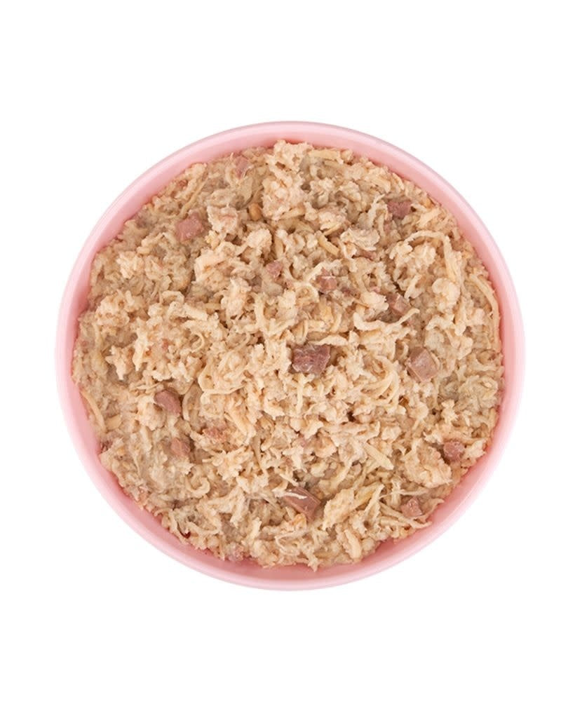 Chicken, chicken broth, sunflower seed oil, chicken liver, egg, dicalcium phosphate, calcium lactate, potassium chloride, inulin, taurine, salmon oil, choline chloride, salt, magnesium sulfate, ferrous sulfate, thiamine mononitrate (vitamin B1), vitamin E supplement, sodium selenite, niacin (vitamin B3), zinc oxide, vitamin A supplement, biotin, vitamin B12 supplement, copper amino acid chelate, manganous oxide, calcium pantothenate, riboflavin supplement (vitamin B2), pyridoxine hydrochloride (vitamin B6), folic acid, potassium iodide, vitamin D3 supplement.