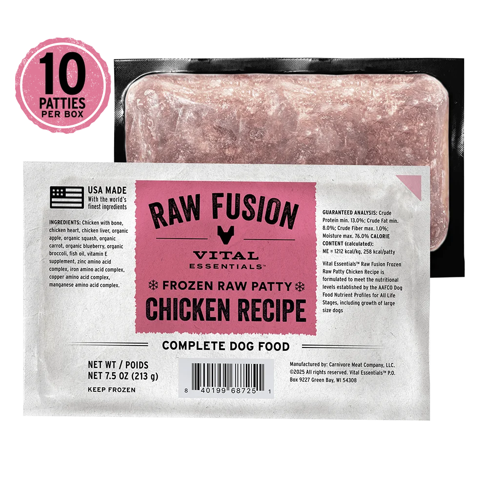 Vital Essentials RAW FUSION is rich in protein to provide your dog with the health and vitality they deserve. We've taken our Butcher Cut Protein and blended it with nutrient-packed organic fruit and vegetables to create RAW FUSION. Simply thaw and serve. No mixing or cooking required.