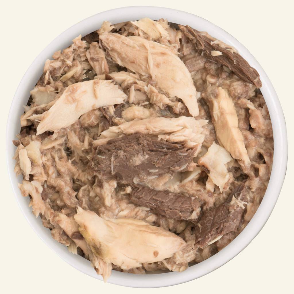 Whether it is a chicken, beef, or fish based formula, we start by flaking the fleshy, meaty cuts off the bone. We then hand place these ingredients into cans, thereby allowing you to see the cuts we use and how we process them. By using lean cuts, such as the only cut of chicken we use, boneless, skinless white breast chicken, we keep both calorie content and fat content low.
