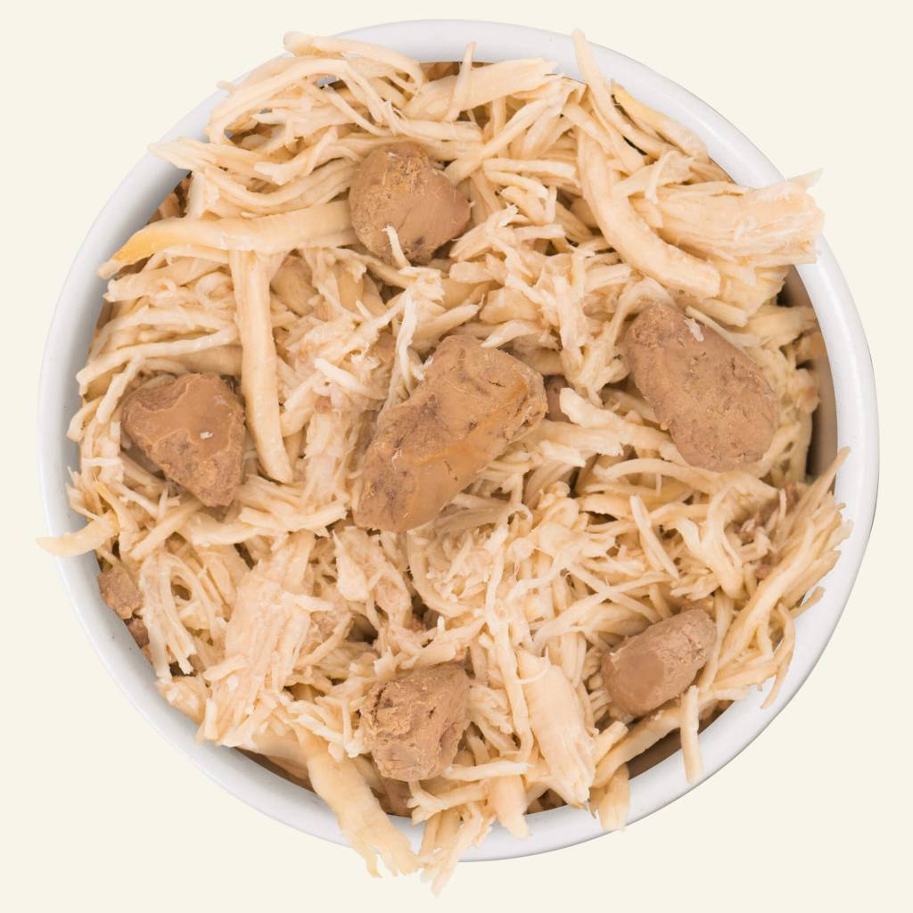 Chicken (Boneless, Skinless, White Breast), Water Sufficient For Processing, Chicken Liver, Potato Starch, Sunflower Seed Oil, Xanthan Gum, Dicalcium Phosphate, Choline Chloride, Taurine, Vitamin E Supplement, Zinc Sulfate, Thiamine Mononitrate (Vitamin B1), Nicotinic Acid (Vitamin B3), Ferrous Sulfate, Calcium Pantothenate, Vitamin A Supplement, Potassium Iodide, Manganese Sulfate, Vitamin D3 Supplement, Copper Sulfate, Riboflavin Supplement (Vitamin B2), Pyridoxine Hydrochloride (Vitamin B6), Folic Acid, Vitamin B12 Supplement