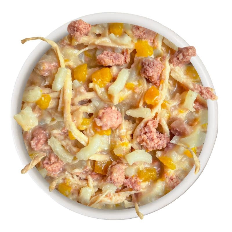 Chicken, Chicken Broth, Rice, Pumpkin, Sunflower Seed Oil, Fish Oil, Tricalcium Phosphate, Guar Gum, Salt, Inulin, Potassium Chloride, Zinc Amino Acid Complex, Choline Chloride, Magnesium Sulfate, Iron Amino Acid Complex, Vitamin E Supplement, Calcium Pantothenate, Manganese Amino Acid Complex, Thiamine Mononitrate, Niacin, Vitamin A Supplement, Copper Amino Acid Complex, Sodium Selenite, Pyridoxine Hydrochloride (Vitamin B6), Riboflavin Supplement (Vitamin B2), Folic Acid, Potassium Iodide, Vitamin D3 Supplement, Vitamin B12 Supplement